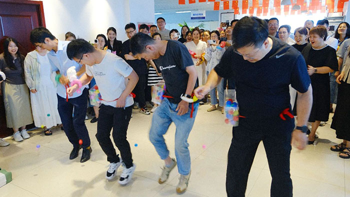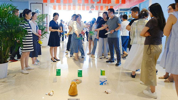 接著近半年入職的小伙伴們輪流登臺做自我介紹,并分隊開始進行丟沙包。這邊用力擲出,那邊左閃右避,不時做出高難度跳躍動作。觀眾們的加油聲高過一陣又一陣,現(xiàn)場洋溢著青春活力氛圍。