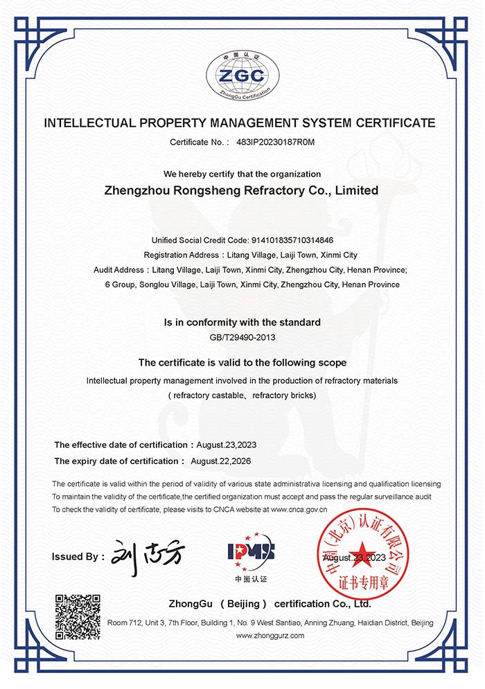 近日,鄭州榮盛窯爐耐火材料有限公司(以下簡(jiǎn)稱(chēng)「榮盛耐材」)順利通過(guò)知識(shí)產(chǎn)權(quán)貫標(biāo),并獲得了《知識(shí)產(chǎn)權(quán)管理》中英文雙語(yǔ)。該項(xiàng)的順利通過(guò),標(biāo)志著榮盛耐材構(gòu)建了一套規(guī)范化、系統(tǒng)化、程序化、精細(xì)化的知識(shí)產(chǎn)權(quán)管理。