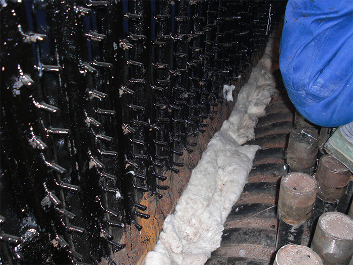 因金屬材料與耐磨材料受熱后線脹系數(shù)的差異,在耐磨耐火材料施工前,必需在金屬材料( 包括銷釘, 托板及管子) 表面涂瀝青, 涂刷瀝清是在澆注料與受熱面之間留有一定的間隙, 運(yùn)行時(shí)受熱面熱膨脹差不會(huì)對(duì)耐磨材料造成破壞。