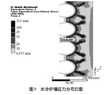 焚燒爐余熱發(fā)電鍋爐水冷壁配置厚度70 ~ 110mm 耐火可塑料或者澆注料,使用后會出現銷釘頭端面以外的耐火材料分層并脫落,脫落區(qū)域附近有細小裂紋。根據圖9 所示水冷爐壁應力模擬分析可知,高溫條下,金屬錨固件的熱膨脹大于耐火材料的,在耐火材料與金屬銷釘界面應力較大區(qū)域,大量銷釘共同作用使耐火材料產生分層,導致耐火材料脫落。