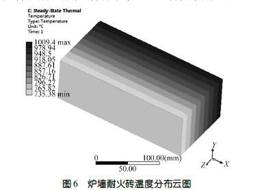 焚燒爐運行過程中爐墻受熱,爐墻內、外溫度存在差異。爐墻耐火磚模擬分析的溫度分布云圖如圖6 所示,構成爐墻的碳化硅磚由內部到外部存在較大的溫度梯度。工作面與非工作面溫度的差異使耐火磚向火面產生的膨脹比背火面的大。同時,焚燒爐內不同燃燒區(qū)域爐墻溫度分布不均,使爐墻在溫度較高的部位膨脹量較大。由于爐墻受爐體尺寸的約束,使整個爐墻產生較大的內應力,溫度越高的區(qū)域產生的內應力越大,這導致高溫區(qū)爐墻有向爐內凸起、鼓包的趨勢。爐墻鼓包、凸起還與超負荷運營、工藝溫度控制、起停爐頻次、操作水平以及爐墻設計有關。