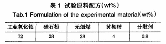 試驗以工業(yè)氧化鋁、硅石粉為主要原料,外加無煙煤,以黃糊精為結(jié)合劑,另外加少量分散劑。試驗基本配方如表1所示。其中工業(yè)氧化鋁的相組成為:70-80%為γ-Al2O3,5-10%為α-Al2O3,5-10%為三水鋁石。