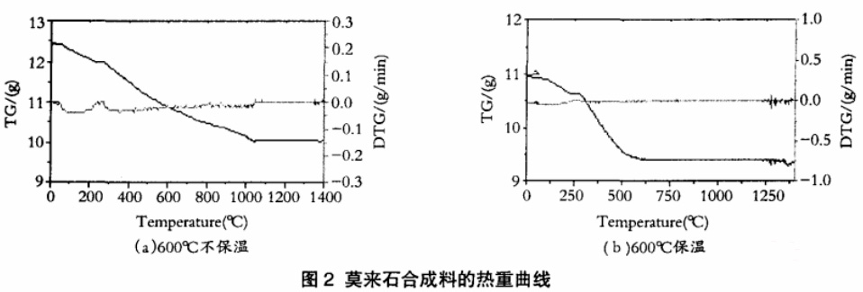由于DSC-TG分析的測量用料量大多≤100mg,并且要磨成細(xì)粉。這種實驗方法很難代表混合料實際的情況,且缺乏均勻性和代表性,從動力學(xué)上也不能反映澆注料加熱過程的實阮變化情況。目前對于尺寸和質(zhì)量大的試樣,只能通過試樣加熱前后質(zhì)量的變化來表征總的反應(yīng)情況。用整體的樣塊大試樣加熱更接近真實。大試樣熱重儀對烘干后的試樣進(jìn)行熱重分析,測定室溫至1400℃過程中重量的變化,結(jié)果如圖2(a)所示。由圖可知,在連續(xù)加熱不保溫的情況下,質(zhì)量一直到1100℃才保持穩(wěn)定。根據(jù)DSC-TG及大試樣熱重分析結(jié)果,混合料在1200℃以上均可生成莫來石,只是莫來石的生成速度和轉(zhuǎn)化率隨溫度不同而會有所差異。本工作的主要目的是合成具有微孔結(jié)構(gòu)的莫來石骨料,既要求合成料有一定的氣孔率,孔徑小、體密輕,又要求其強(qiáng)度高,即要有理想的莫來石轉(zhuǎn)化率,同時還要兼顧煅燒設(shè)備投資、生產(chǎn)成本等,因此摸索理想熱處理制度對本工作而言至關(guān)重要。