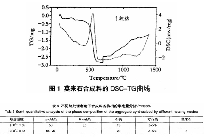 將原料放在共磨機(jī)中以料:球:水重量比1:1:1濕法共磨,轉(zhuǎn)速為300rpm。研磨時間為24小時,將共磨后的物料在直徑為30mm,高為50mm的圓柱形模具中成型。成型試樣在110℃干燥箱中烘干24小時,然后進(jìn)行熱處理。試樣在空氣中自然干燥48小時后脫模。把工業(yè)氧化鋁配好的混合料進(jìn)行了DSC-TG和大試樣熱重分析,以此判定無煙煤的燒失溫度和莫來石化的開始溫度。為進(jìn)而制定合理的熱處理制度提供依據(jù)。比較了兩種煅燒制度對莫來石轉(zhuǎn)化率的影響:一為單調(diào)升溫,然后保溫;另一為在高低兩個溫度分段保溫。如表2、表3。按相關(guān)標(biāo)準(zhǔn)檢測了燒后試樣的體積密度、顯氣孔率。