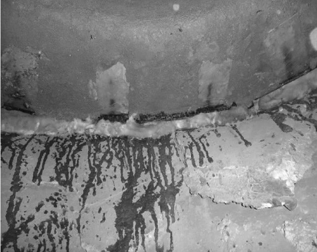 3、耐磨可塑料施工??伤芰戏笤O(shè)在施工構(gòu)件上后,用木錘或橡皮錘搗打密實。塊與塊之間的接縫也應(yīng)搗打密實,使接縫嚴密,將表面壓光、壓平。所施工部位與原來墻體接縫處應(yīng)確保平滑過渡,不得凹進或凸出。用磷酸鋁溶液浸泡硅酸鋁纖維板封堵膨脹縫,避免鍋爐運行過程中出現(xiàn)竄風(fēng)現(xiàn)象,導(dǎo)致非金屬補償器燒損。耐磨可塑料施工完畢后的膨脹縫封堵如圖4所示。