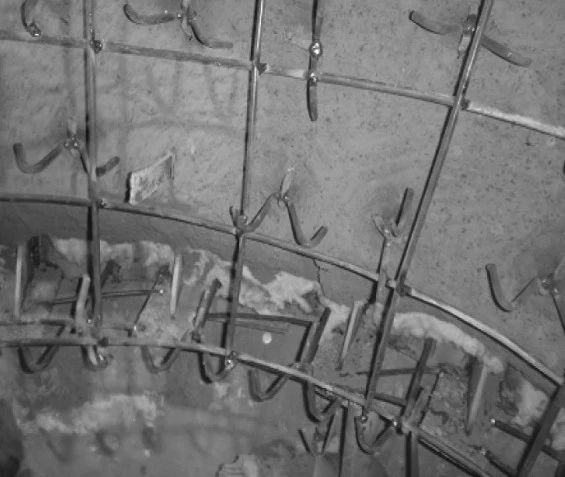 (4)原錨固件為Y銷釘,每隔150mm交錯布置,銷釘端部沒有鋼筋網(wǎng)格,使耐火材料無法形成整體,個別銷釘失效后會使局部耐火材料松動,相鄰耐火材料之間沒有可靠聯(lián)系,zui終脫落。
