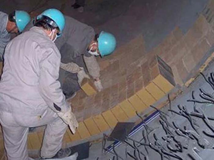 受到的是壓、拉、扭、剪的綜合機(jī)械應(yīng)力。窯的轉(zhuǎn)動(dòng),筒體橢圓度,襯磚和筒體之間及磚與磚之間的擠壓、扭動(dòng)、窯筒體變形,都會(huì)在磚襯之間產(chǎn)生機(jī)械應(yīng)力。當(dāng)筒體與輪帶間隙較大,使窯筒體橢圓度增大,襯磚受交變應(yīng)力增加,輪帶部位所受的機(jī)械應(yīng)力更為嚴(yán)重。我廠在更新磚后曾發(fā)生窯筒體彎曲,劇烈振動(dòng)加上窯襯時(shí)有局部過熱,引起胴體變形擠壓內(nèi)襯,再之托輪調(diào)整費(fèi)時(shí)較長,在距窯前6m整三號輪帶處發(fā)生紅窯,耐火磚在一個(gè)部位大面積脫落,挖補(bǔ),托輪調(diào)整正常窯體不再振動(dòng),此次之后再未發(fā)生紅窯現(xiàn)象。